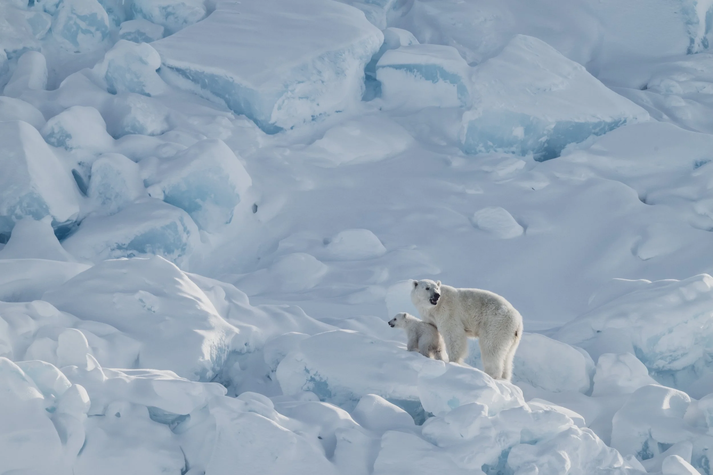 A mother leads her cubs across the exposed rock — no ice beneath their feet, only memory. She moves with quiet certainty, teaching them how to be in a world that is changing beneath them.